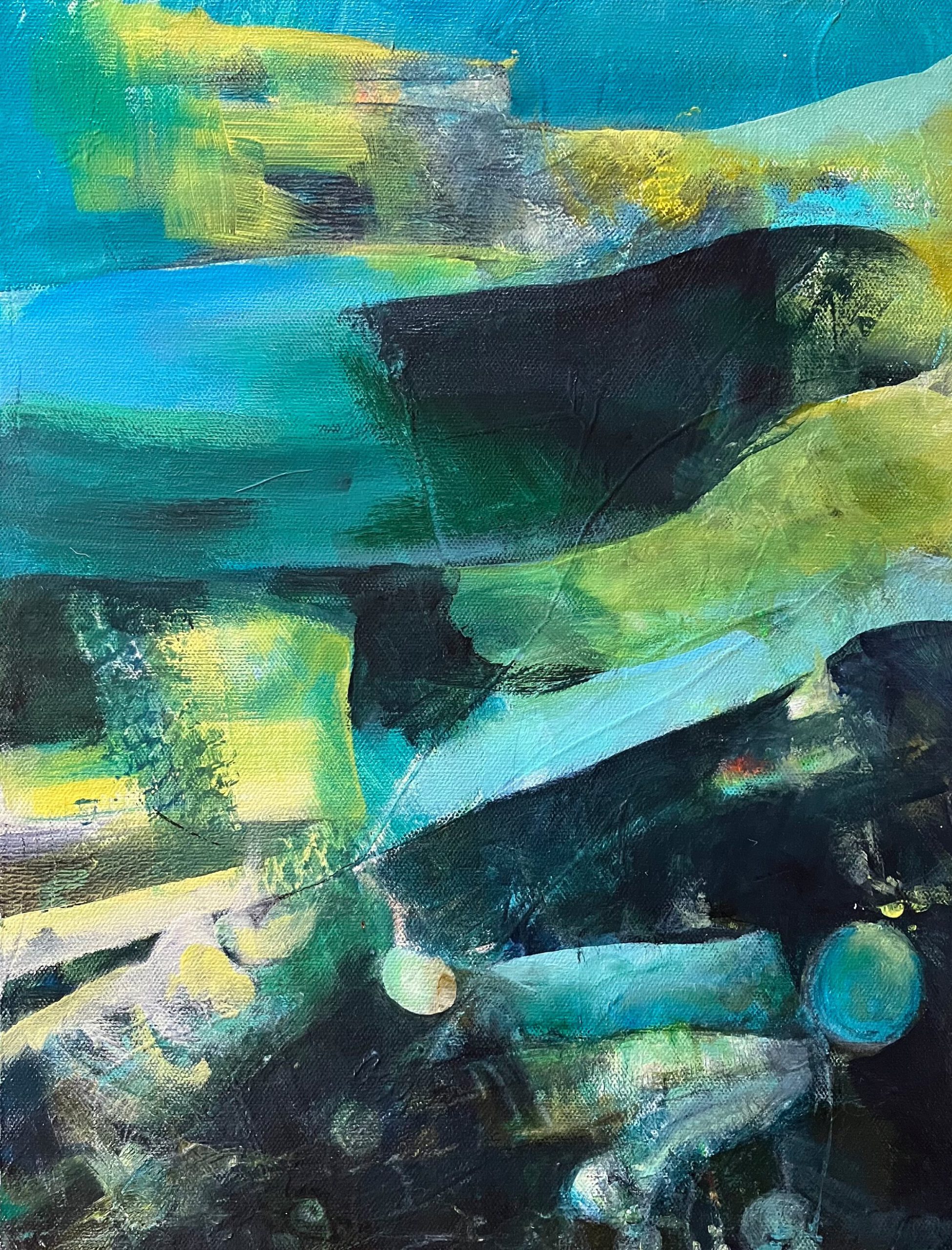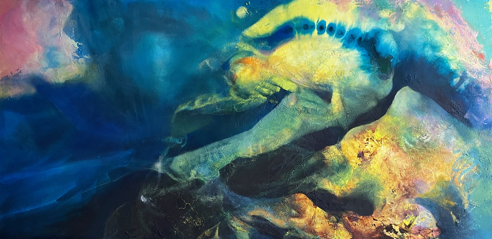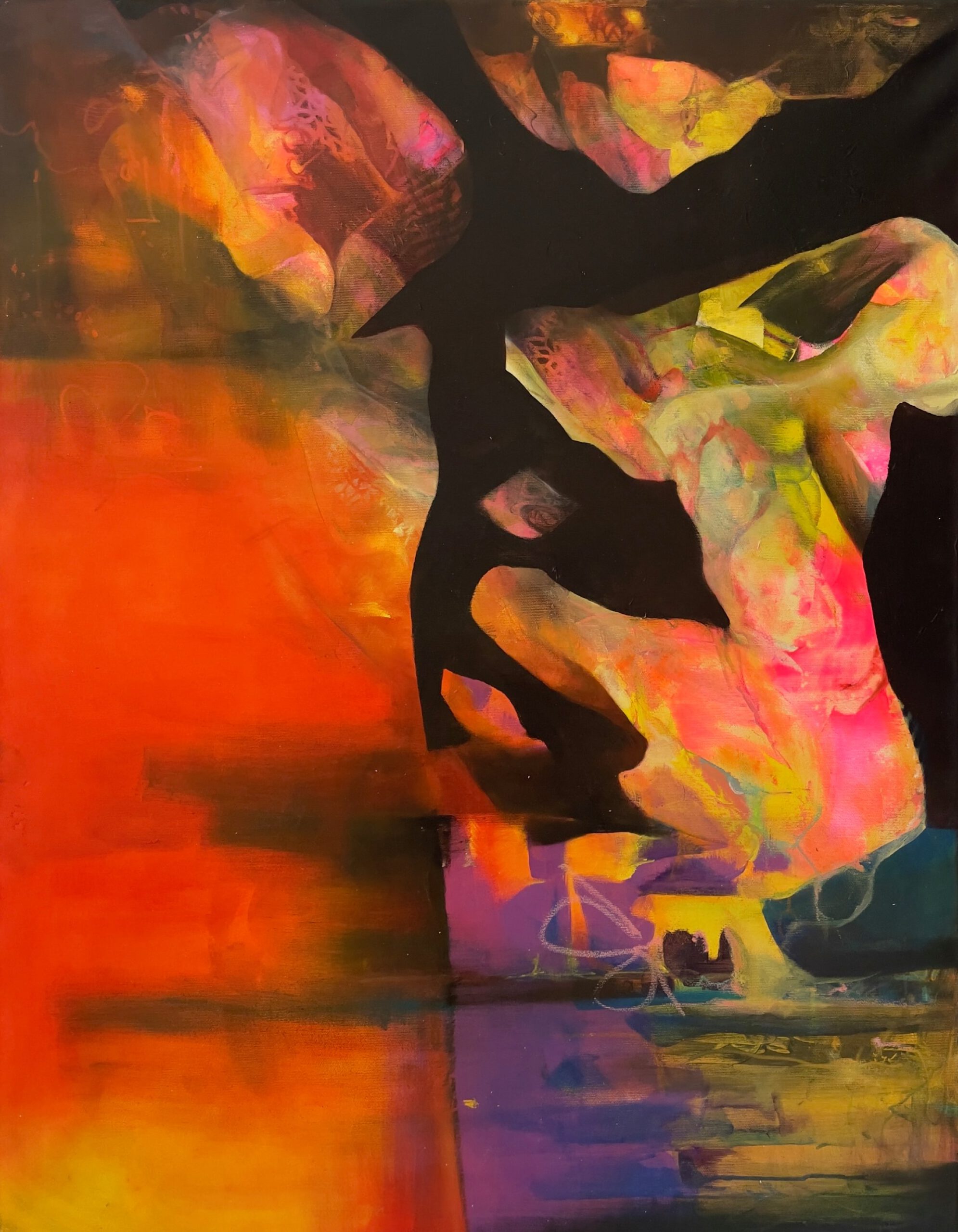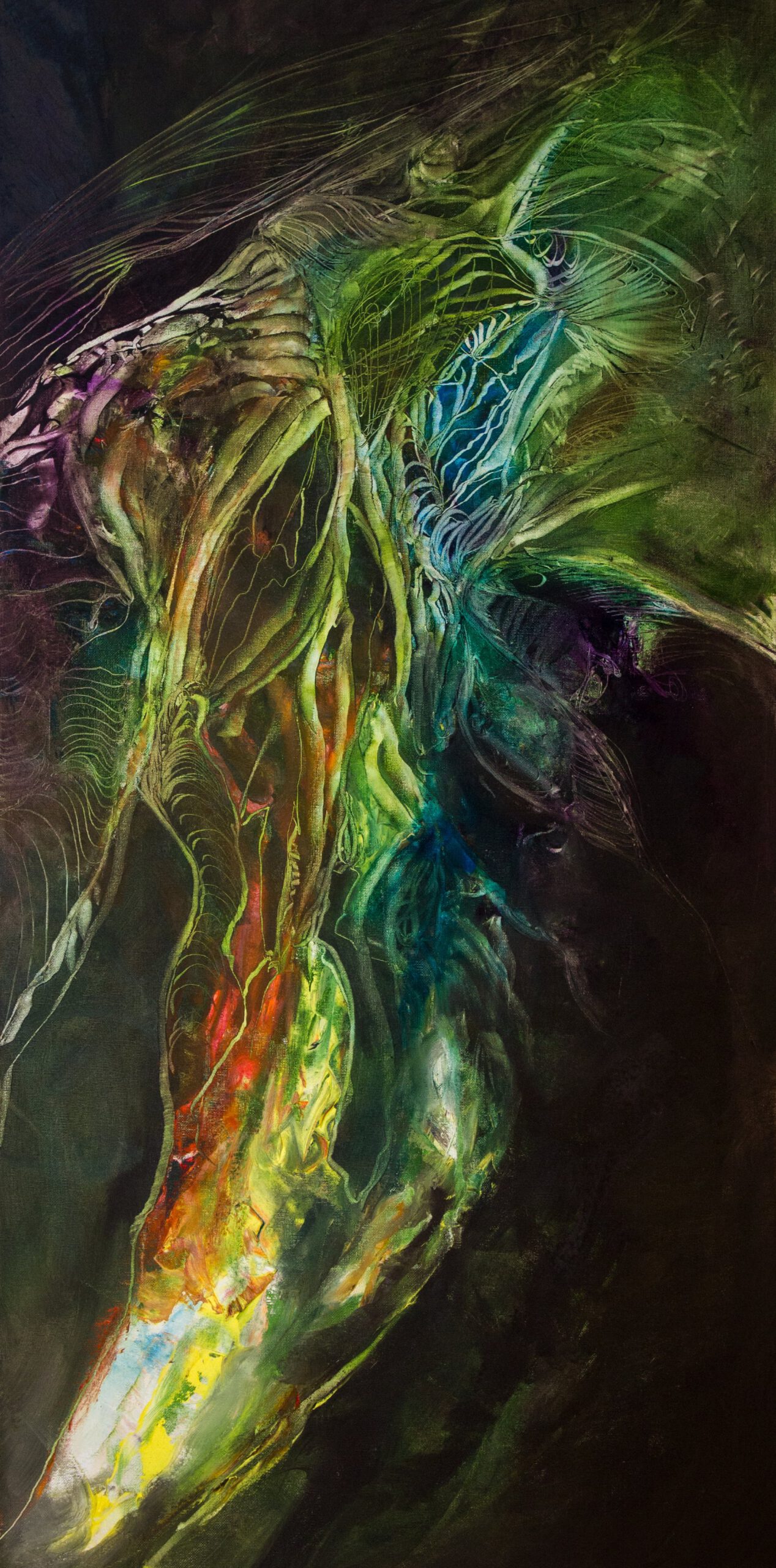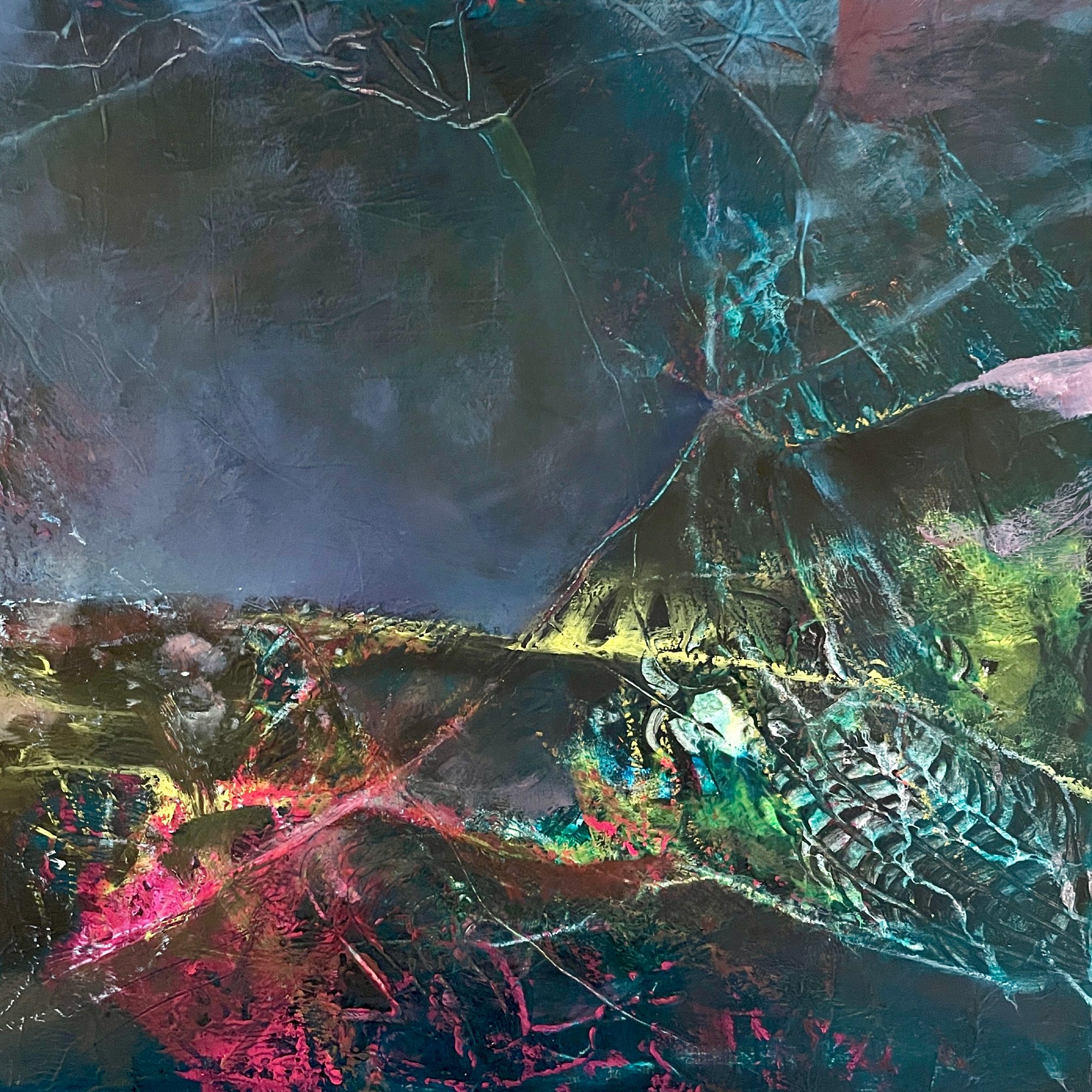 These paintings move between density and transparency, between deep shadow and sudden colour. Forms appear, dissolve, re-form. Over time a quiet network becomes visible: lines, traces, fragments of light that connect what seems separate. Not as a solution — as a pulse.